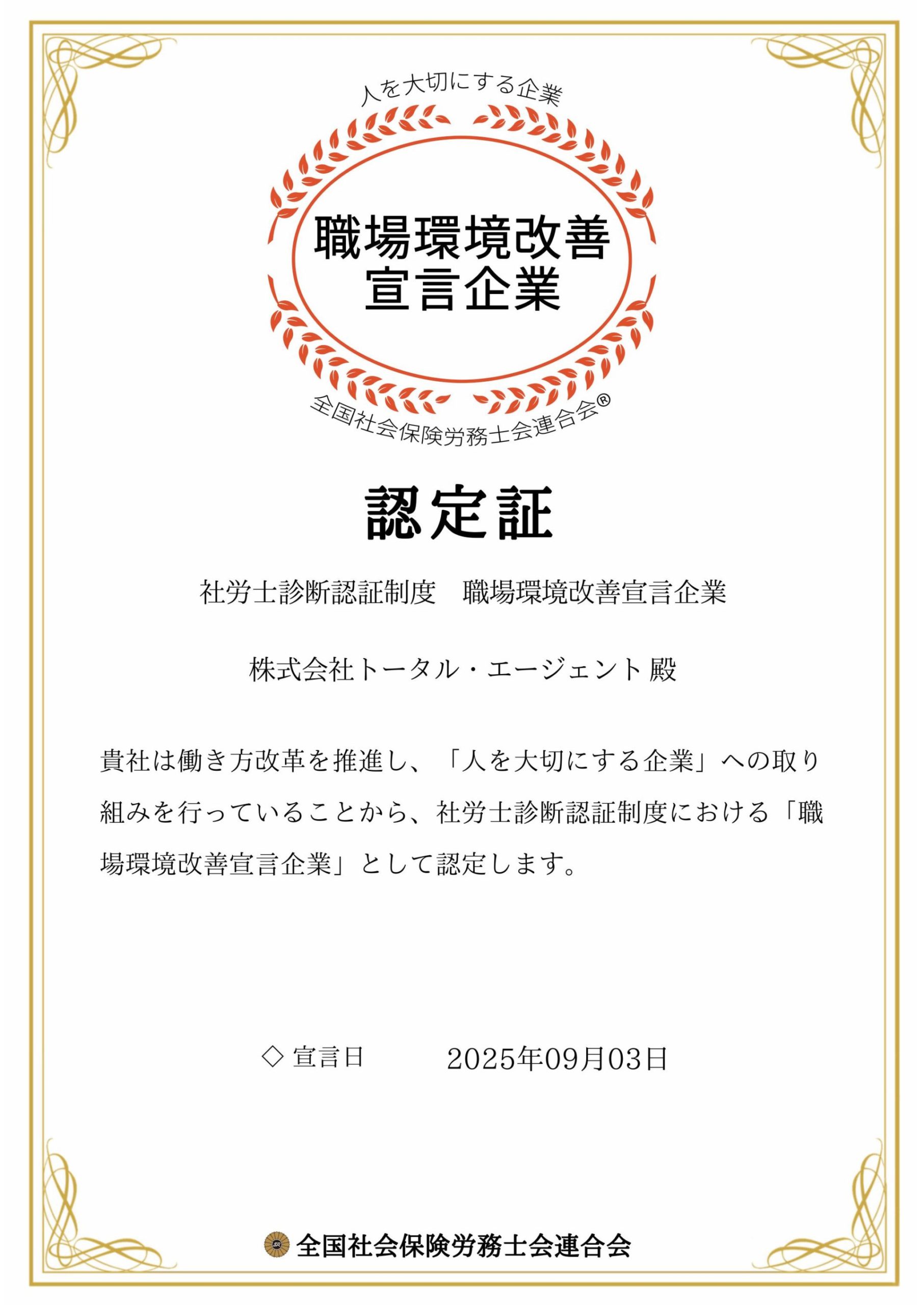 社労士診断認証制度における「職場環境改善宣言企業」として去年度認定頂きましたが、更新の手続きを行い今年度も認定頂きました。株式会社トータル・エージェントは引き続き働き方改革を推進し、「人を大切にする企業」への取り組みを行って参ります。